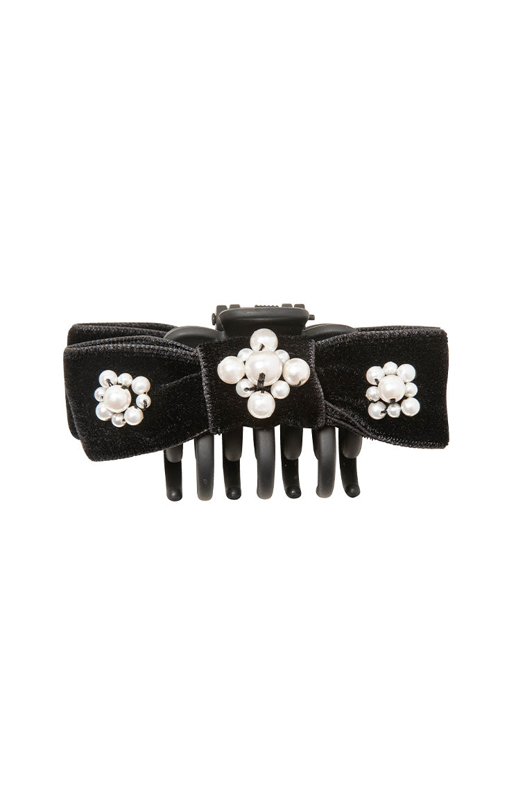 The Maggie Jaw Clip finds our beloved bow shape. hand-embroidered with unexpectedly majestic pearl clusters. Each one is made by hand in New York. using the most luxurious silk velvet ribbon. It's anchored by a sturdy jaw clip. making it a breeze to sweep hair half-up. all the way back. and into any style in between.